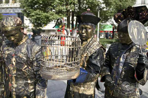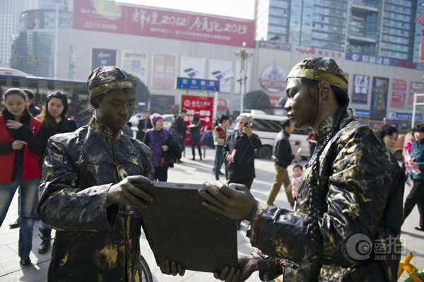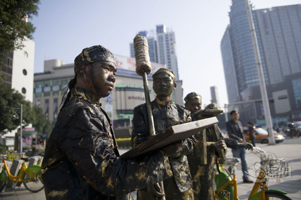株洲市民在路過株洲市中心廣場(chǎng)電信大樓前坪時(shí)看到這些雕塑,以為時(shí)下流行的穿越劇情降臨株洲,摸一摸,才敢確信這些雕塑是真人版。