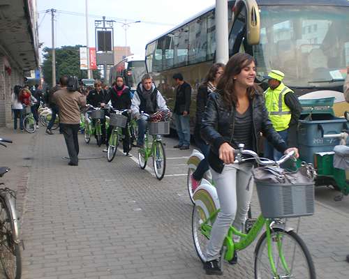 10.29日蘇州某旅行社為法國(guó)旅行團(tuán)租借公共自行車游蘇州古城區(qū),公共自行車成為外地游客游玩蘇州的一種新型的旅行方式。