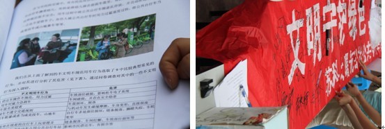 本次活動開始前,蘇州科技學(xué)院“死飛”社團(tuán)帶來的自行車精彩特技表演吸引了眾多路人的目光,拉開了本次活動的序幕。本次活動主要分為以下幾個過程,首先,蘇州市政協(xié)委員、蘇州科技學(xué)院教授姜正平發(fā)表講話,姜教授表達(dá)了他對蘇州公共自行車的快速發(fā)展的祝賀,并表示即日起,從自身做起,同時也提倡蘇州市民們綠色出行,做到短途以自行車代步,長途以私家車等出行的方式。接著,由曙光公社社長鄭偉向蘇州公共自行車管理中心張主任提交歷經(jīng)三個月的調(diào)研成果——《公共自行車文明使用與宣傳調(diào)研報(bào)告》,張主管發(fā)表講話,在充分肯定了曙光公社為宣傳公共自行車文明使用做出的努力外,也表達(dá)了對青年學(xué)生積極參與公益活動的熱情和活力的感謝,同時號召更多市民加入文明用車行列,加入愛護(hù)自行車的隊(duì)伍中來!然后,我們進(jìn)行了現(xiàn)場問答環(huán)節(jié),市民們踴躍搶答,在歡樂氛圍中了解了車籃載小孩、坐在車樁上玩耍等眾多不文明用車的現(xiàn)象。最后,橫幅簽名表決心以及我們的抽獎環(huán)節(jié)。